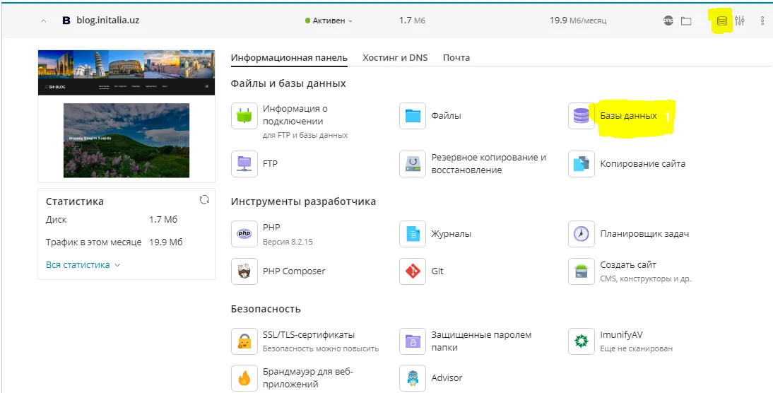 Hostingizdagi boshqaruv panelida (Plesk yo boshqa) saytingiz sozlamalari orasida ma'lumotlar bazasini (база данных) topasiz va kirasiz. Yangi baza yaratasiz. Shundan so'ng bazangiz boshqaruv paneliga (PHPmyAdmin) kirasiz. Saytingizga ma'lumotlar bazasini ulash uchun "ulanish haqidagi ma'lumot"ga kirasiz. Rasmda ma'lumotlar bazasi va u haqidagi muhim ma'lumotlar qismi sariq rangda belgilangan.
