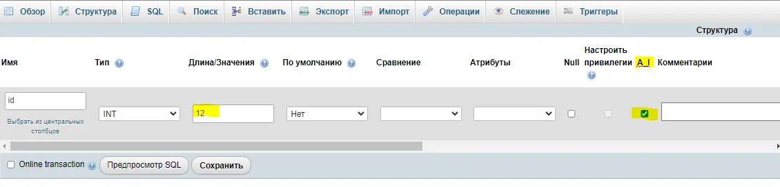 PHPmyAdminga kirgandan so'ng yangi baza yaratasiz. Baza nomini "views" deb qo'yasiz, qatorlar soniga 4 ni belgilaysiz. Shundan so'ng to'ldirilishi kerak bo'lgan jadval paydo bo'ladi. Rasmda to'ldirilishi shart bo'lgan qismlarini sariqqa olganman.